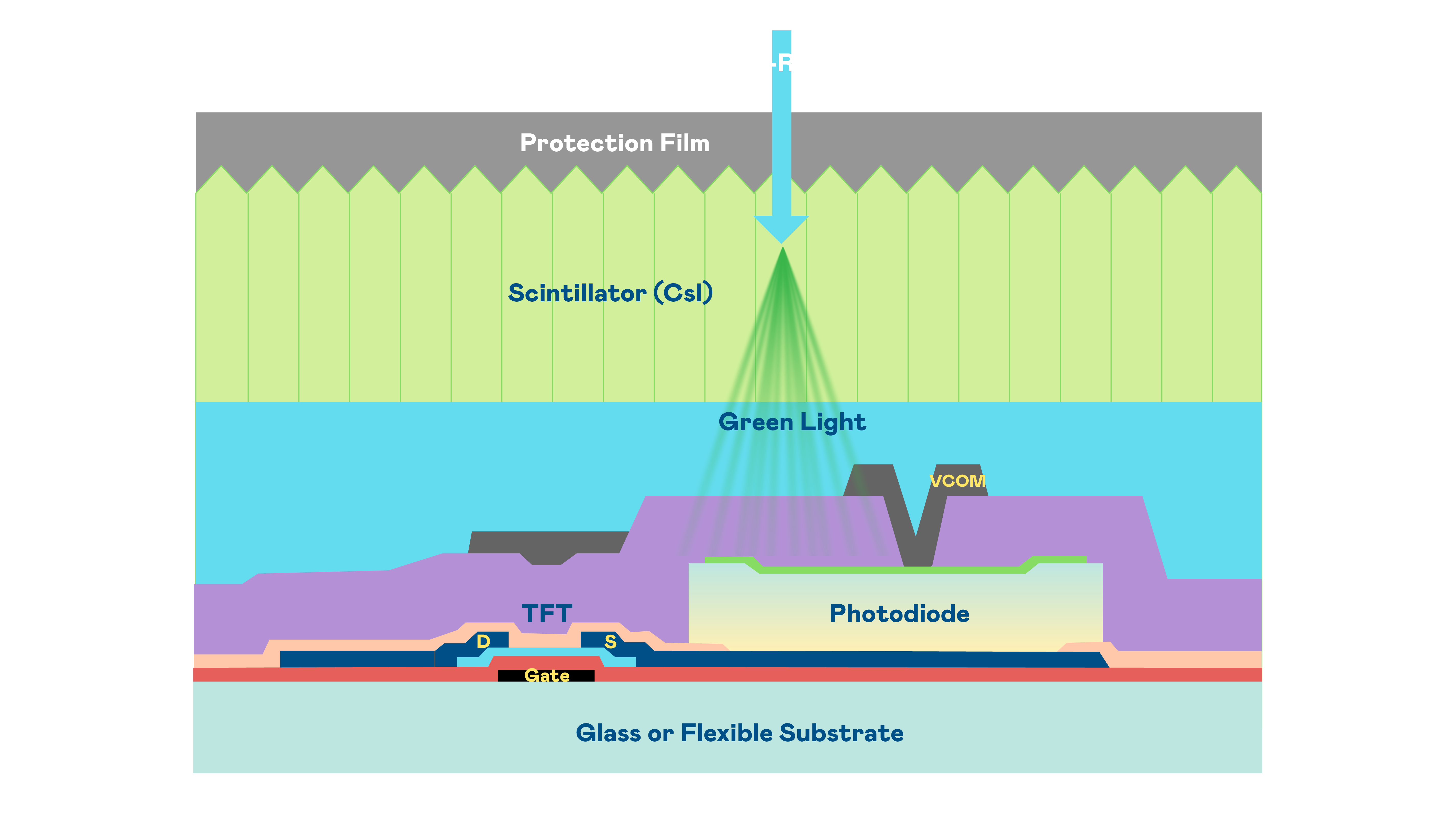 ag真人国际官网的X光影像感测阵列使用薄膜电晶体 (TFT) 作为每个像素的读取开关,搭配光电二极体(Photodiode)的光电转换元件,用以感测X光影像讯号。